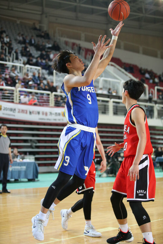 | 연세대 박지원(좌)이 레이업 슛을 시도하고 있다. |