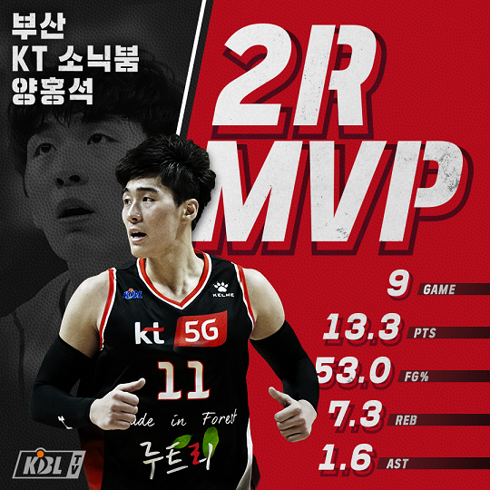 2라운드 9경기 동안 평균 29분 41초를 출전해 13.3득점, 7.3리바운드를 기록한 양홍석은 11월 20일(화) 서울 삼성과의 경기와 11월 25일(일) 전주 KCC 경기에서 데뷔 후 최다 득점(23득점)을 올리는 등 부산 KT가 7시즌 만에 5연승을 거두는데 크게 기여하며, 팀을 단독 2위로 올려 놓았다.