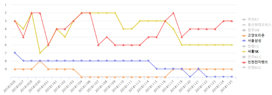위의 사진을 보면 전자랜드가 10월 말부터 11월 중반까지 순위 변동이 심했음을 알 수 있다. 할로웨이 부상이 발생한 시점. 전자랜드는 할로웨이 부상 이후 3경기를 내리 패하며 개막 3연승의 상승세를 이어가지 못했다.