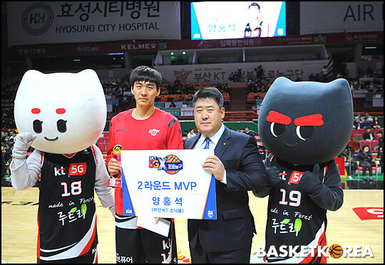 [바스켓 코리아 = 부산 / 박영태 기자] 7일 부산 사직체육관에서 열린 2018-2019 SKT 5GX 프로농구 부산 KT와 울산 현대모비스의 경기에서 KT 양홍석이 2라운드 MVP 시상을 하고 있다.