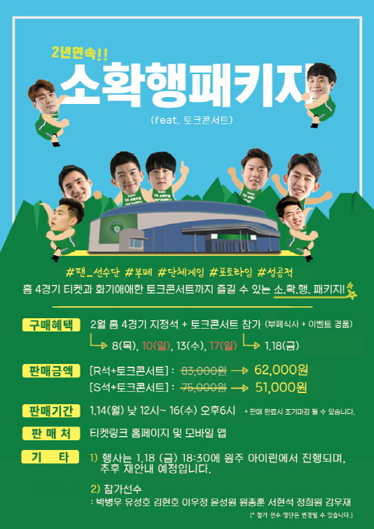 원주 DB는 2월8일부터 17일까지의 원주(홈) 4경기 관람권과 올스타 브레이크 기간인 1월18일(금) 저녁에 진행되는 선수 참여 팬 행사인 토크콘서트에 참가할 수 있는 소확행 패키지를 오는 14일(월) 낮 12시부터 판매한다.