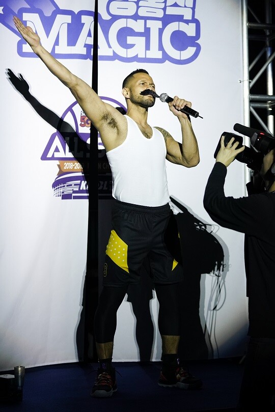 시작은 라건아였다. '백팩 키드 춤'으로 알려진 고난이도 춤을 능숙하게 추면서 환호를 끌어냈다. 라건아 특유의 익살스런 표정까지 더해지면서 체육관은 순식간에 함성의 도가니가 됐다.