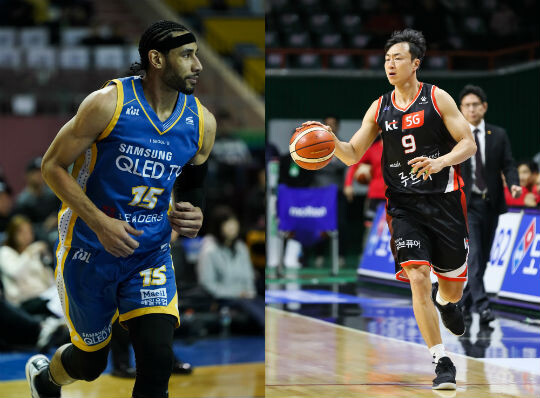 | 서울 삼성의 문태영(왼쪽), 부산 KT의 김영환(오른쪽) |