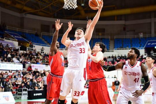 | 이승현이 귀중한 공격 리바운드를 잡아낸 후 풋백을 시도하고 있다. |