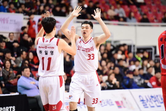 | 자신을 둘러싼 기대감을 현실로 바꿔낸 이승현. 주장 허일영과 하이파이브를 하고 있다. |