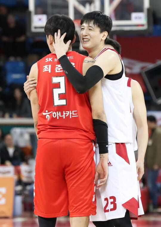 | SK 최준용을 달래고 있는 최진수. 이제는 그를 둘러싼 키워드가 불안에서 안정으로 바뀌고 있다. |
