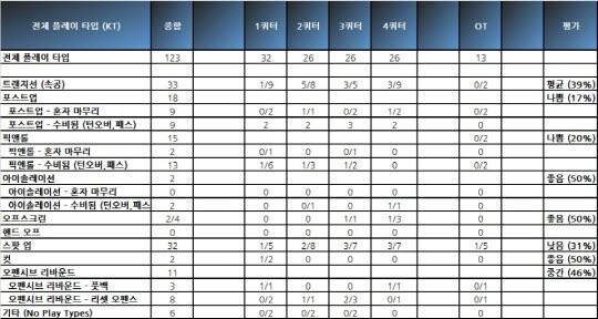스몰 라인업의 장점은 ‘빠른 템포를 가져가기에 유리하다’는 점이다. KT는 이 상황들을 만들어내는 과정은 성공적이었다. 하지만 마무리 짓는데 어려움을 겪었다. 1쿼터와 4쿼터, 연장전에서 최악의 트랜지션 효율을 보여주고 말았다. 20번 중 4번만 성공했다. 이 가운데 턴오버 비율이 25%가 되었다.