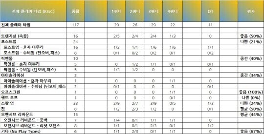 결론부터 이야기하면 이러한 양팀의 주요 득점 루트 효율성에서 KGC가 앞섰고, 이것이 KGC가 승리할 수 있었던 이유로 작용했다. 양 팀이 사용했던 공격 루트를 분석해 보았다.