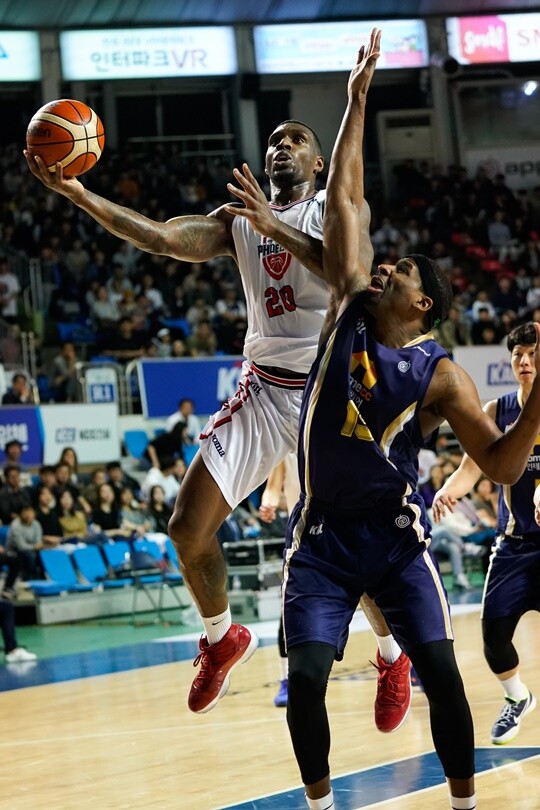 | 라건아(왼쪽)가 브라운(오른쪽)의 수비를 피해 슛을 시도하고 있다. |