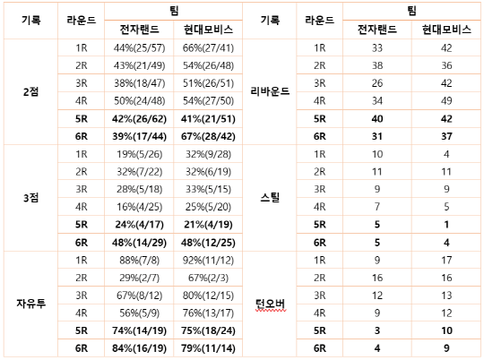 두 팀의 경우도 그러했다. 5라운드에서 양 팀 모두 3점슛 4개씩을 집어넣은 상황, 전자랜드는 2점슛 5개를 더 성공시키며 승리했다. 자유투로는 4점만을 더 내어줬고, 이 점수는 격차를 뒤집을 정도는 아니었다.