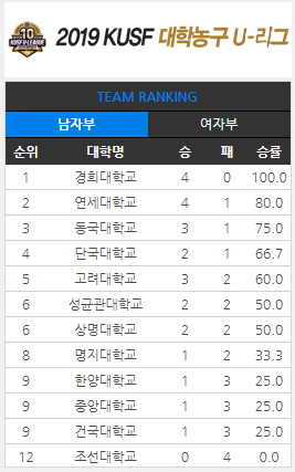 그 외 명지대, 중앙대, 한양대, 건국대는 1승씩을 기록한 채 하위권에 내려앉아 있다. 특히 상위권 전력으로 꼽혔던 중앙대의 성적은 다소 낯설다. 특급 선수는 아니지만, 알짜배기 선수들을 대거 영입하며 선수층 보강에 힘썼던 중앙대는 경희대와 첫 경기에서 석연치 않은 패배를 떠안으며 분위기가 다운됐다. 하루빨리 선수단 분위기를 바로잡는 것이 선결 과제로 보인다.