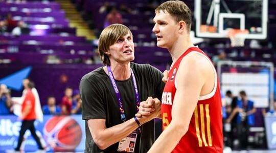 | 티모페이 모즈고프(오른쪽)의 손을 잡고 있는 안드레이 키릴렌코 러시아 농구협회장(왼쪽) |