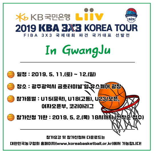 [바스켓코리아 = 김우석 기자] 대한민국농구협회(회장 방열)는 오는 5월 11일부터 12일까지 양일간 광주광역시 금호터미널 앞 유스퀘어 광장에서 KB국민은행 리브(LiiV) 2019 KBA 3x3 KOREA TOUR 광주대회를 개최한다.
