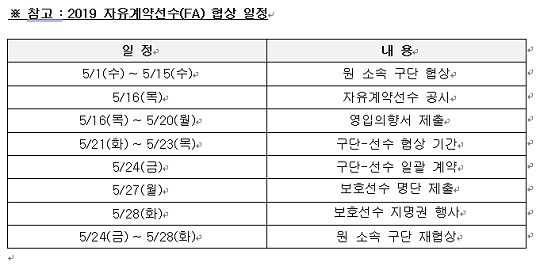 자유계약선수(FA) 대상자인 57명의 선수들은 5월 1일(수)부터 15일(수)까지 원 소속 구단과의 협상을 진행하게 된다.