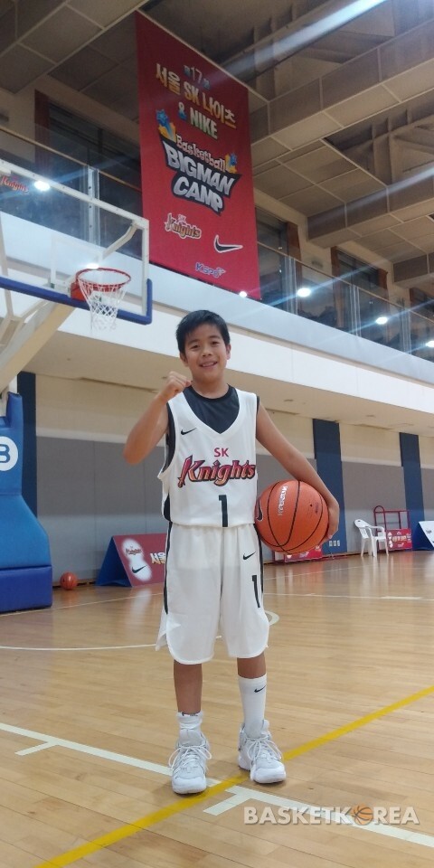 | 환하게 웃으며 포즈를 취하고 있는 서울 SK나이츠 유소년 농구교실 U12 대표팀 가드 이기성 |