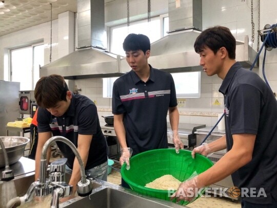 짐을 나르고, 벽지 해체 작업을 마친 선수들은 식당으로 이동했다. 국수를 직접 찬물에 헹군 뒤 양념을 버무렸다. 그리고 아이들과 봉사자들의 점심을 배식했다.