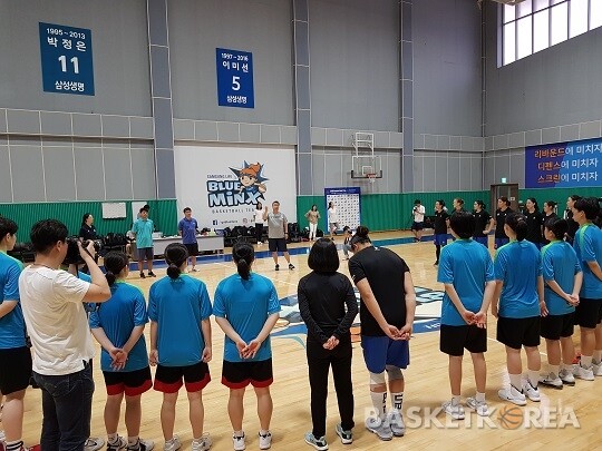 초반에는 사이드 스텝 등 움직임에 대한 훈련을 진행했다. 확실히 현역 선수들과 고교 선수들은 차이가 있었다. 임근배 감독, 이미선 코치를 비롯한 삼성생명 코칭 스태프들은 선수들의 동작을 하나하나 짚으며 차이점에 대해 섬세하게 알려줬다.