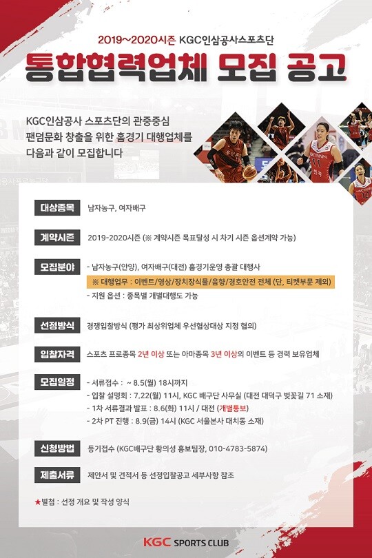 [바스켓코리아 = 김준희 기자] KGC인삼공사 스포츠단이 2019-2020시즌 관중 중심의 팬덤 문화 창출을 위한 통합 협력업체를 모집한다.