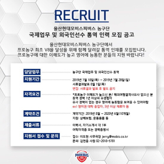 [바스켓코리아 = 김우석 기자] 울산 현대모비스 피버스가 외국선수 통역과 국제업무를 담당할 재원을 모집한다.