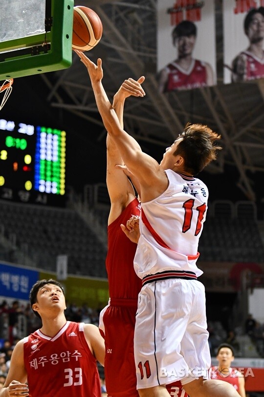[바스켓코리아=고양/신혜지 기자] 현대모비스 배수용이 12일 고양체육관에서 벌어진 2019-20 현대모비스 프로농구에서 오리온의 강한 수비를 피해 레이업 슛을 시도하고 있다.