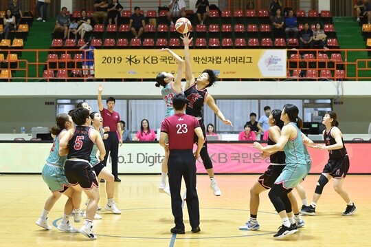 | 박신자컵 당시 BNK와 하나은행의 점프볼 모습. 두 팀이 공식 개막전에서도 만난다. |