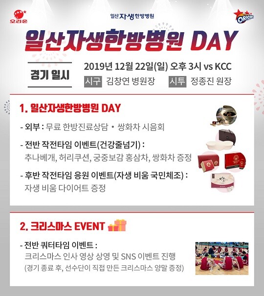 고양 오리온 오리온스(단장 박성규)는 22일(일) 오후 3시 고양체육관에서 열리는 전주 KCC와 홈 경기에서 크리스마스를 앞두고 ‘일산자생한방병원 데이’를 개최한다고 밝혔다.