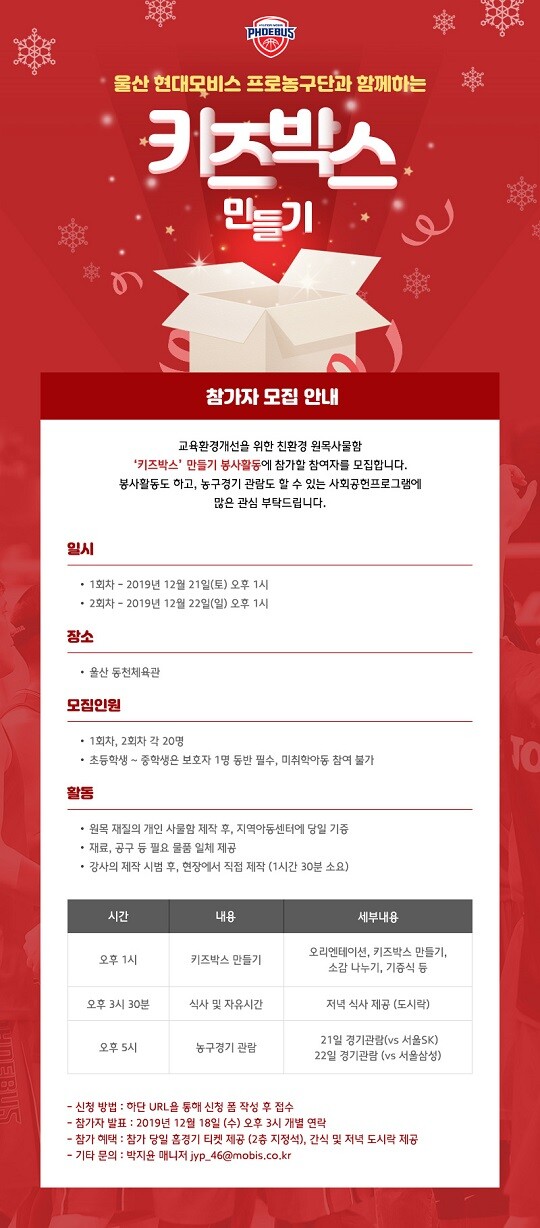 [바스켓코리아 = 김준희 기자] 울산 현대모비스 피버스 프로농구단(단장 박병훈)이 울산지역 아동센터와 함께하는 ‘키즈박스 만들기’ 봉사자를 모집한다.