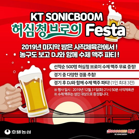 KT는 농구영신 경기 관람을 마친 팬들과 함께 새해 맞이를 축하하기 위한 파티를 기획했다. 파티를 빛내기 위해 부산 지역의 대표호텔 ㈜호텔농심이 자사 맥주 브랜드 ‘허심청브로이’에서 직접 제작한 수제맥주 2,000캔을 통 크게 증정할 예정이다.