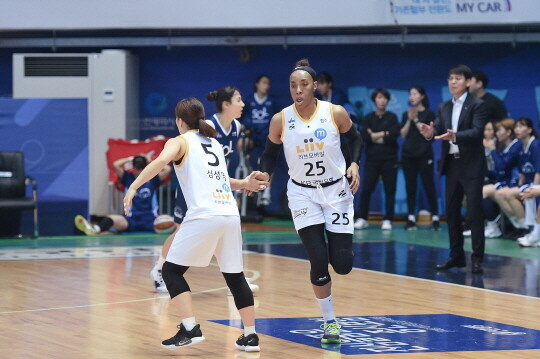 김민정(3점슛 3개 포함 18점 5리바운드)과 카일라 쏜튼(3점슛 1개 포함 17점 13리바운드), 심성영(3점슛 2개 포함 16점 4어시스트)이 51점을 합작, 신인 허예은도 3점슛 1개 포함 9점 5어시스트로 승리의 공을 세웠다.