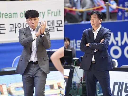 사진 설명 1 = 위성우 우리은행 감독-이훈재 하나은행 감독