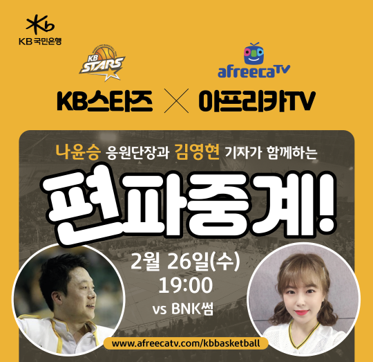 중계는 김영현 농구전문 기자와 KB스타즈 나윤승 응원단장이 진행한다. 김영현 기자의 농구 관련 지식과 나윤승 응원단장의 현장경험을 바탕으로 다양한 경기 정보를 전달하고, 실시간 라이브 채팅을 통해 팬들과의 쌍방향 소통을 진행할 계획이다. KB스타즈 전문 치어리더팀과 함께 온라인 응원전으로 힘을 보탤 본 방송은 아프리카TV(www.afreecatv.com/kbbasketball)를 통해 생중계될 예정이다.