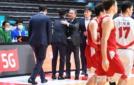 | 경기 후 유재학 감독과 인사를 나누고 있는 김병철 감독대행 |