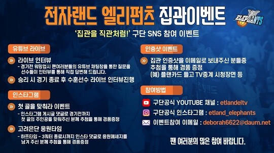 이 밖에도 전자랜드는 ‘고려은단 응원타임!’, ‘수훈 선수 인터뷰’ 등을 통해 고려은단 비타민 C 음료, 닥터 에슬리 화장품 등 푸짐한 경품을 배포할 예정이며, 자세한 사항은 전자랜드 농구단 인스타그램(@etland_elephants)에서 확인할 수 있다.
