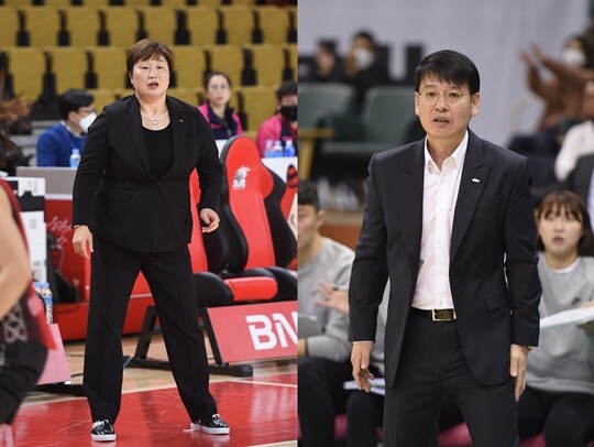 사진 설명 1 = 유영주 BNK 감독-정상일 신한은행 감독