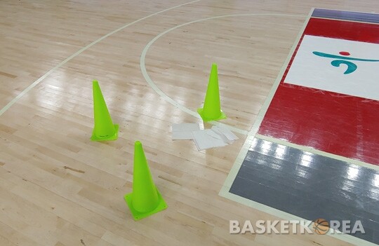 그런데 못 보던 게 생겼다. 한 쪽 골대 3점 라인 안에 콘 3개와 휴지 조각이 있었다. 훈련 용도는 전혀 아닌 듯했다. 먼저 와 있던 한 기자가 “그 쪽으로 물이 계속 떨어졌다”며 콘이 있던 이유를 알렸다.