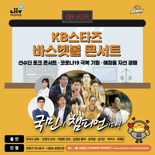 아프리카TV를 통해 생중계될 ‘KB스타즈 바스켓볼 콘서트’는 유창근 장내 아나운서의 진행으로 4쿼터로 구성된다. 1쿼터와 2쿼터에는 안덕수 감독을 비롯한 코칭스탭이 주장 강아정과 출연해 지난 경기를 돌아보고 봄농구에 대한 기대와 각오를 전달할 예정이다. 또한, 장기간의 재활로 모습을 볼 수 없었던 김가은도 출연해 오랜만에 팬들에게 소식을 전하는 시간이 마련되며, 김경란 통역이 동반 출연하여 현장 이야기를 전달할 계획이다.