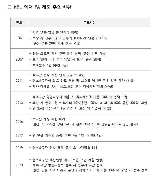 KBL은 2019~2020 시즌 종료 후 FA 관련 제도를 더욱 자유롭게 만들었다. 원소속구단 우선 협상을 폐지한 게 대표적이다. FA가 된 선수들이 모든 구단과 자율 협상을 할 수 있도록 설정한 조치였다.