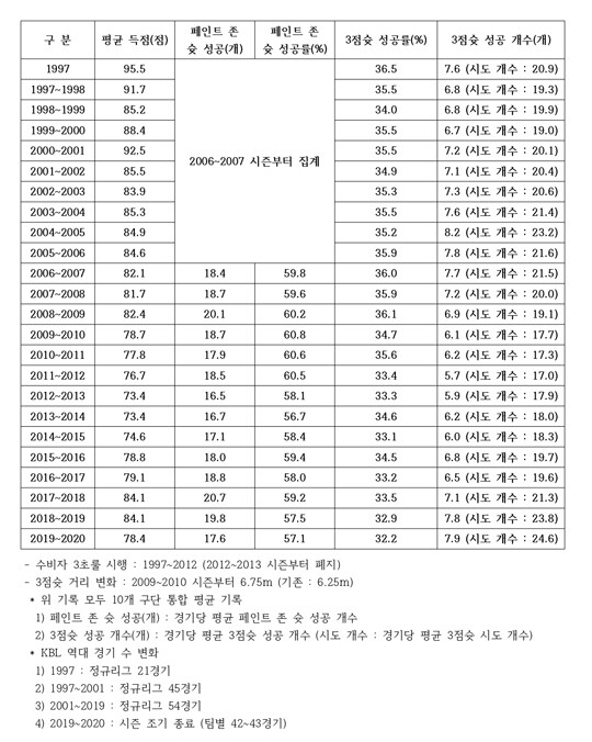 시간이 어느 정도 흘렀고, 3점슛 거리 변화 역시 큰 의미로 다가오지 않았다. 달라진 슈팅 거리에 적응하는 선수들이 많았고, 속공에서 자신 있게 3점을 쏘는 선수들도 많아졌다. 외국선수 제도 변화에 따른 영향도 있었지만, 선수들은 찬스 때 3점을 쏘는 걸 주저하지 않았다.