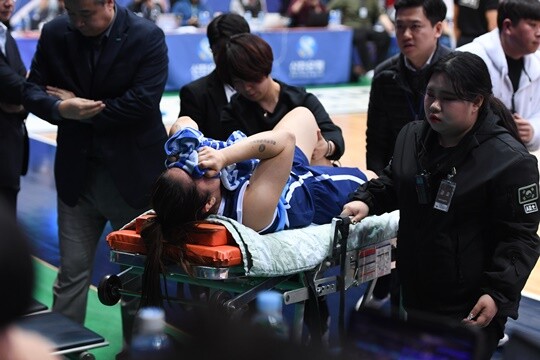 | 부상으로 코트를 빠져나가고 있는 김애나. |