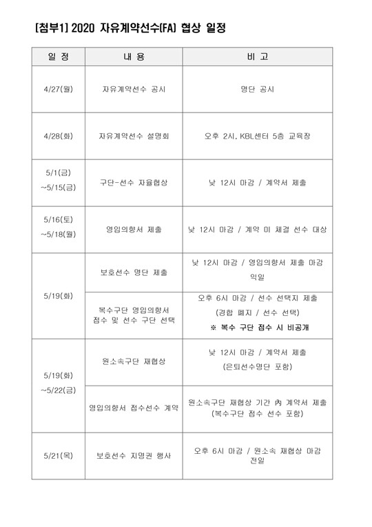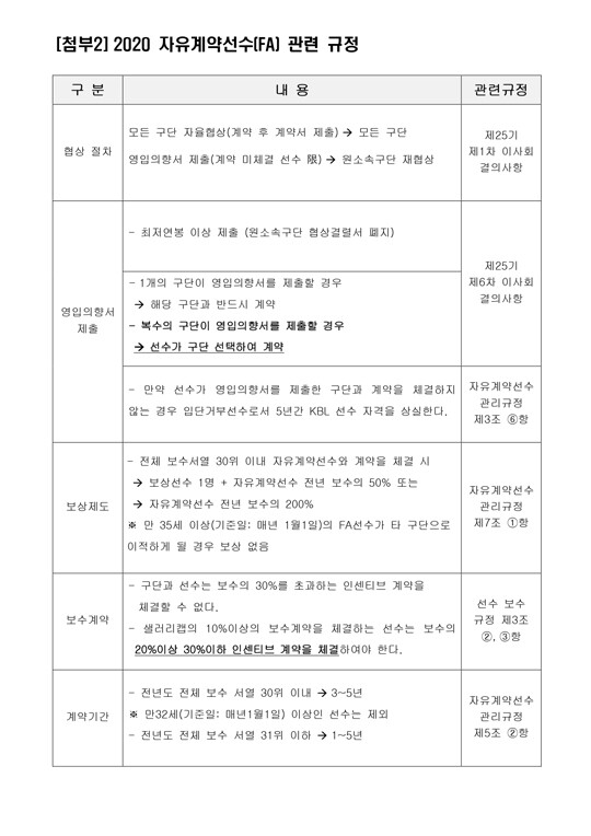 2020 KBL 자유계약선수(FA) 협상은 기존에 진행했던 원 소속 구단 우선협상이 폐지 되고, 10개 구단과 선수 간의 자율협상으로 시작 된다. 자율협상 이후 계약 미체결 선수를 대상으로 구단에서 영입의향서를 제출하고, 복수구단 영입의향서 제출 시 구단 제시 금액과 상관없이 선수가 구단을 선택할 수 있다. 영입의향서를 받지 못한 선수들은 원 소속 구단과의 재협상을 갖게 된다.