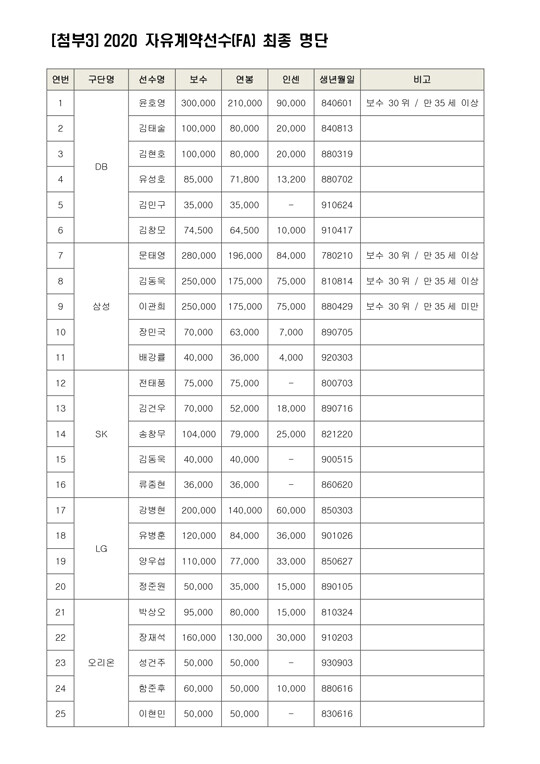2019~2020 시즌 계약 만료 대상 선수 총 54명 中 강바일(삼성), 장문호(SK), 주지훈(LG), 정진욱(KT)까지 4명의 선수는 2019-2020시즌 구단 별 출전 가능 경기 1/2 미달에 따른 계약 연장으로 자유계약선수(FA) 명단에서 제외됐으며, 2018년 FA 미 체결 선수였던 이지원(前 현대모비스) 선수를 포함해 총 51명이 2020 자유계약선수(FA) 최종 대상자가 됐다.