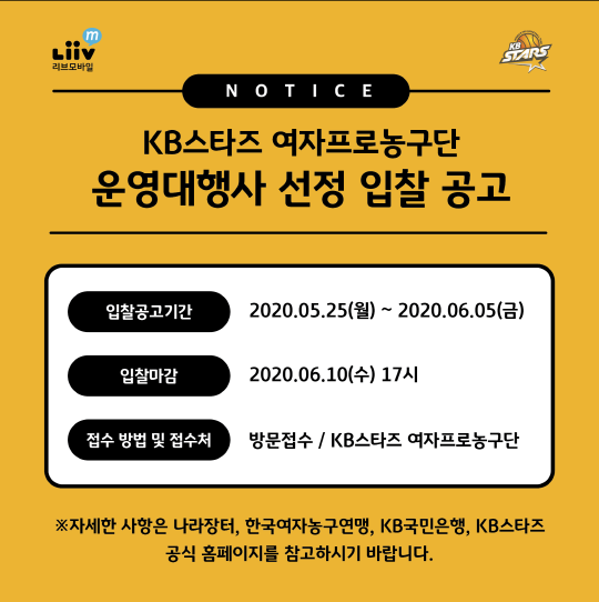 접수 기간은 6월 10일(수) 오후 5시까지이며, 입찰참가신청서, 제안서 등 입찰에 필요한 서류 양식과 목록, 기타 자세한 내용은 나라장터, 한국여자농구연맹, KB국민은행, KB스타즈 농구단 공식 홈페이지에서 확인할 수 있다.