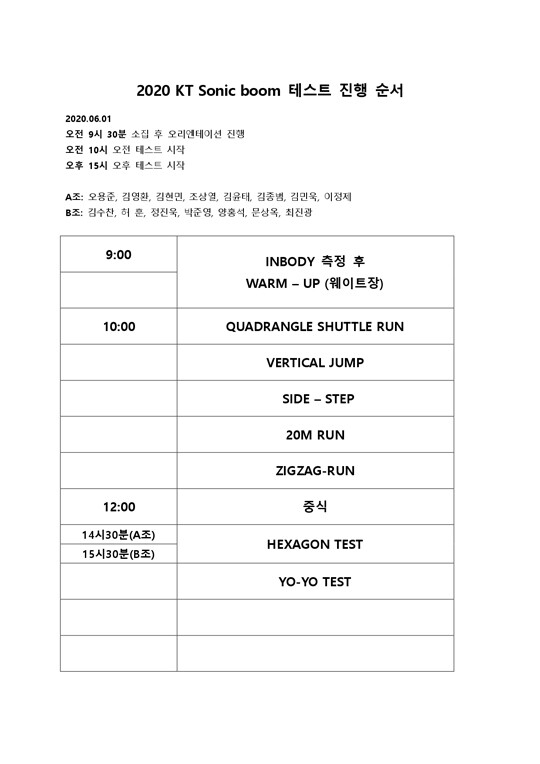 [부산 kt 소닉붐, 6월 1일 체력 테스트 시간표]