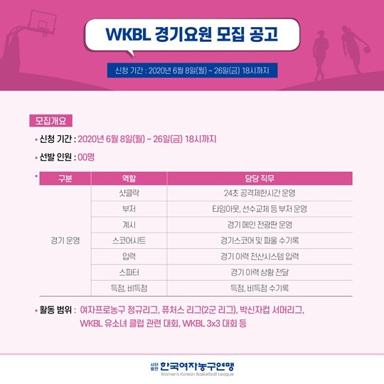 WKBL(한국여자농구연맹)이 원활한 경기 진행을 위한 경기 요원을 공개 모집한다.