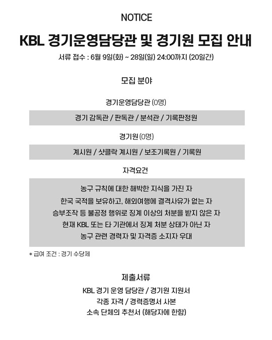KBL 경기운영담당관 및 경기원 모집 응시는 6월 28일(일)까지 이메일과 우편 또는 직접 방문으로 접수 가능하며, 자세한 사항은 KBL 홈페이지(www.kbl.or.kr) 에서 확인할 수 있다.