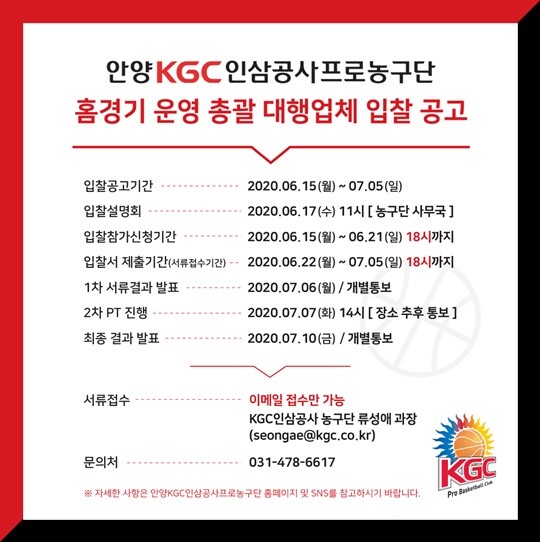 [바스켓코리아 = 김영훈 기자] KGC가 홈경기 운영 대행 업체를 찾는다.